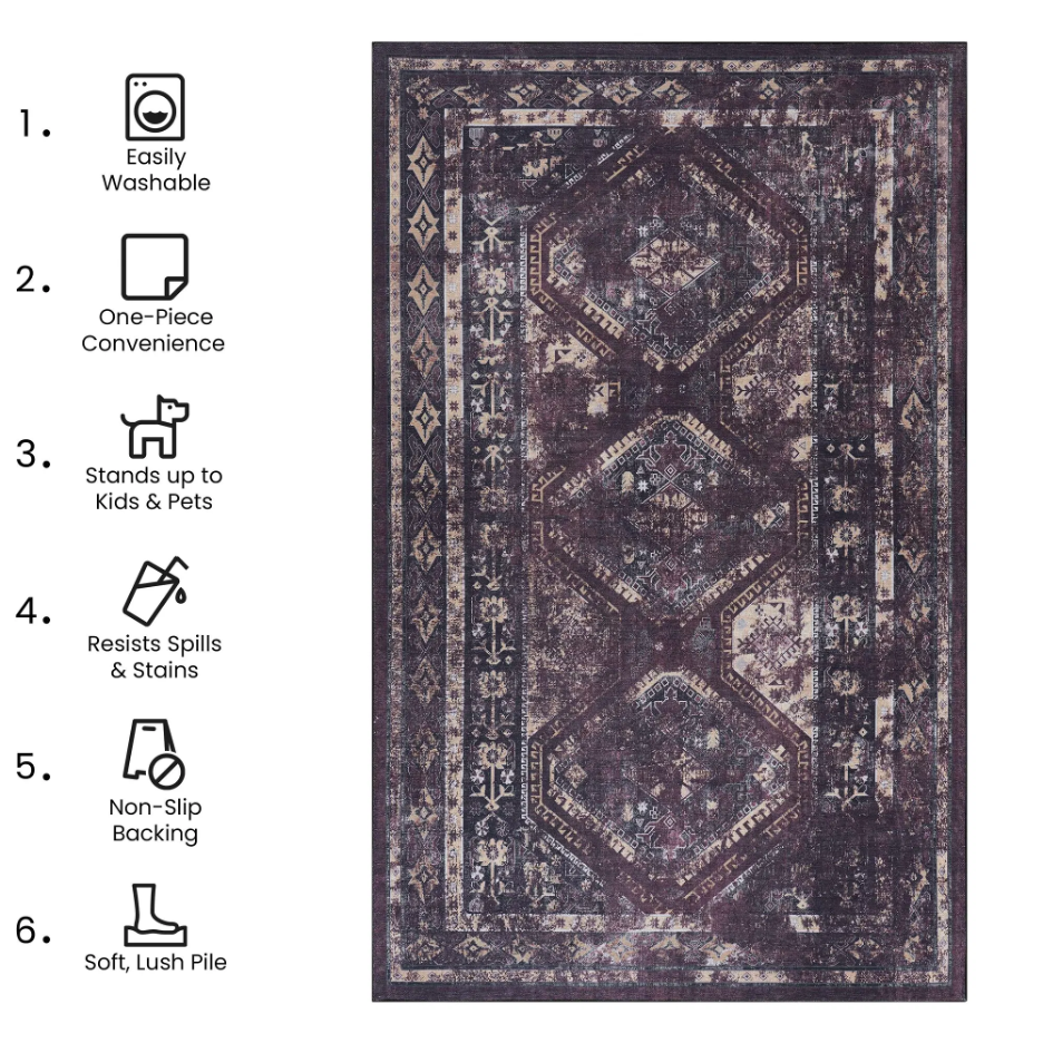 Looking for the perfect machine washable area rug that blends elegance and functionality? Look no further than our versatile area rugs, meticulously crafted to harmonize with every corner of your home. With its low-pile construction, effortlessly complements various indoor settings. Its special features, including machine washability, non-slip backing, and stain resistance, make it an ideal choice for high-traffic areas like the living room, dining room, bedroom, hallway, kitchen, or playroom.