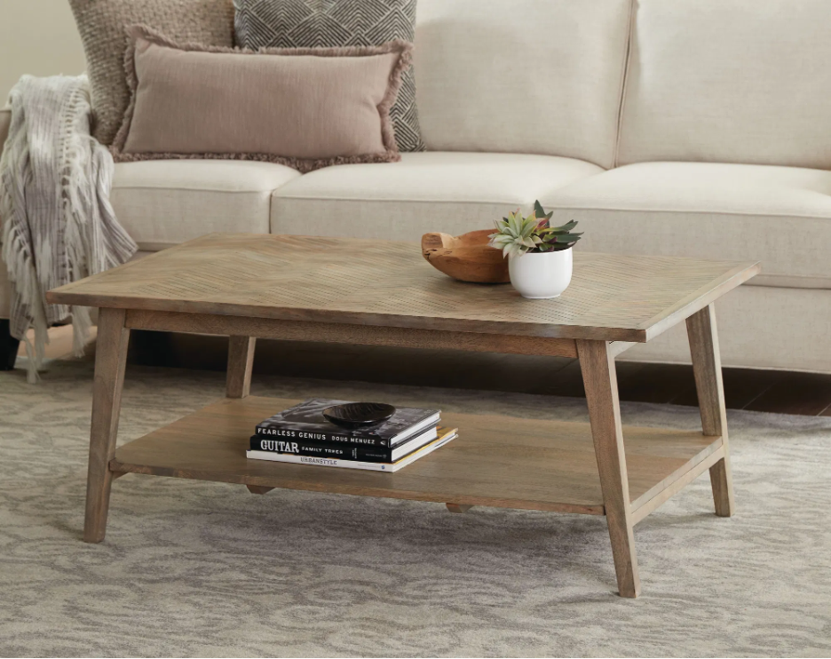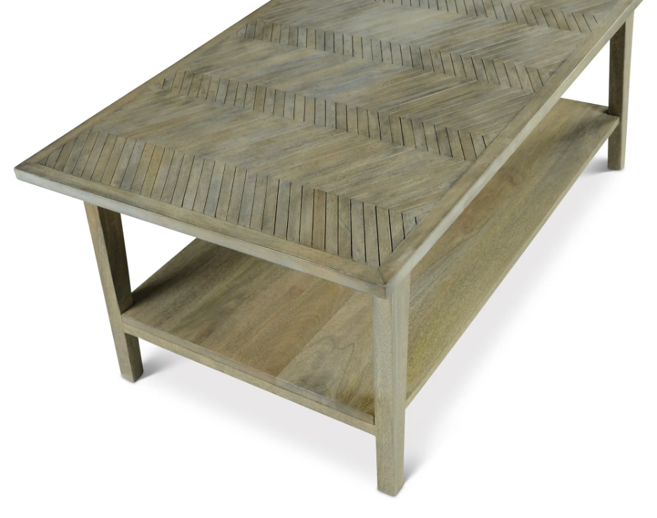 Styling details mid-century modern canted legs, bottom shelf for display or storage and chevron patterned top