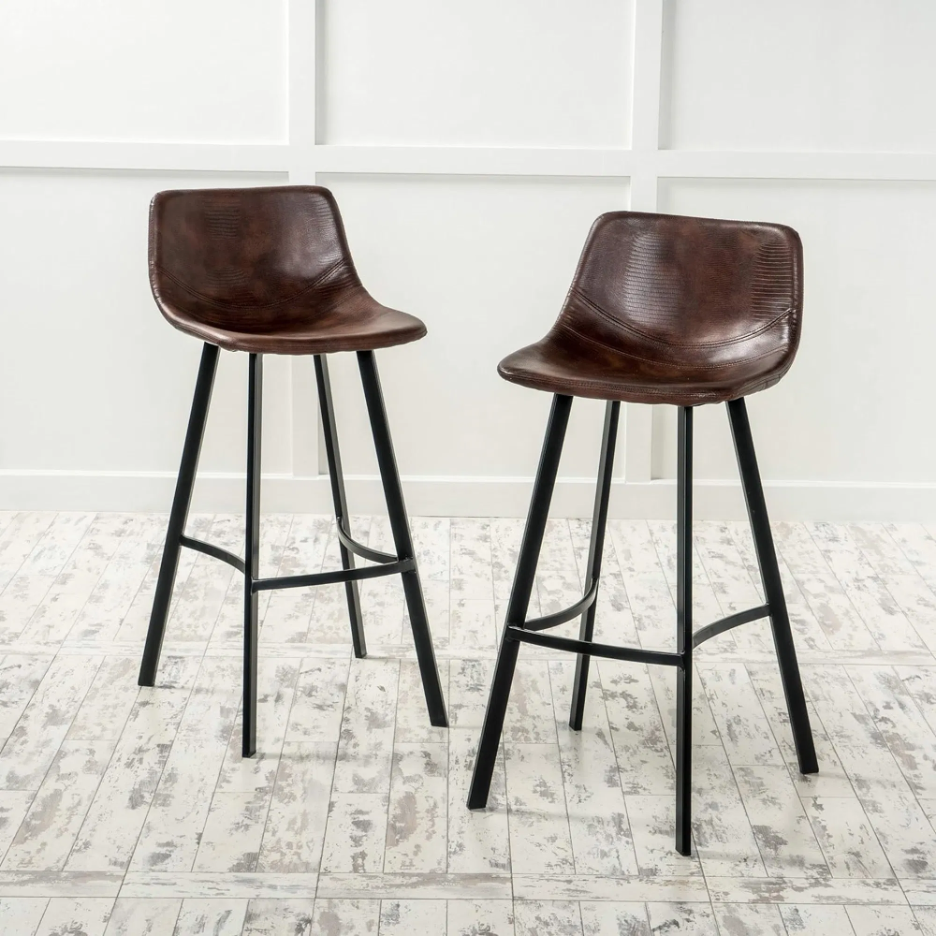 Product DescriptionPerch yourself at your home bar or kitchen island and enjoy the sun filtering through your windows as you savor a delectable breakfast. Our barstool set is a stunning addition to any home with its curved seating and sleek matte base.Featuring a faux snakeskin design with intricate stitching, these barstools will instantly upgrade your decor with a touch of modern style.Detailed Specifications*Includes: Two (2) Barstools*Material: Faux Leather*Leg MaterIal: Steel*Hand-Crafted DetailsDIMENSIONS:Each stool is 18.75' W x 20.25' D x 37.00' H. You will love how much your space can transform with the simple addition of this charming barstool set.