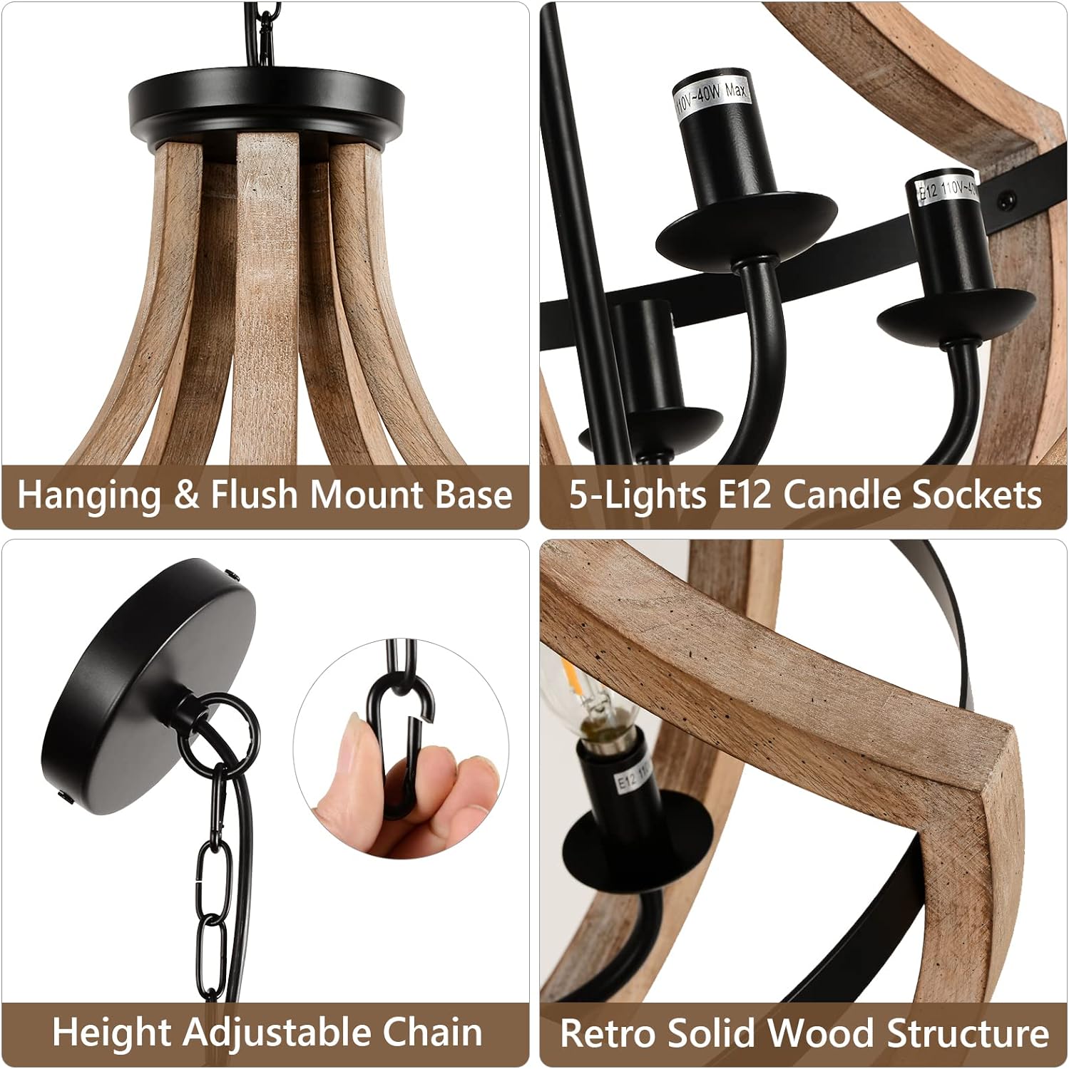 ❤ [Beautiful Farmhouse Fixture] This 5 light restaurant fixture consists of vintage brown solid wood and black candle sockets. Handmade solid wood rustic chandeliers are more eco-friendly and natural. This modern farmhouse chandelier is full of elegance, vintage, and rustic style. It will add a natural flavor to your kitchen island, living room, bedroom, dining room at the dining table, foyer, entrance, and more.