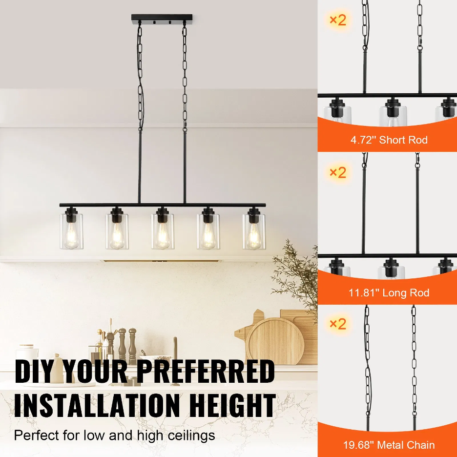 1.Compatible with All E26 Bulbs: Designed with 5 lights, each supporting up to 60W, our pendant lights kitchen island is compatible with all types of E26 bulbs, including LED, halogen, incandescent, and CFL bulbs. Customize your lighting experience with the bulbs of your choice. (Note: Bulbs not included.)